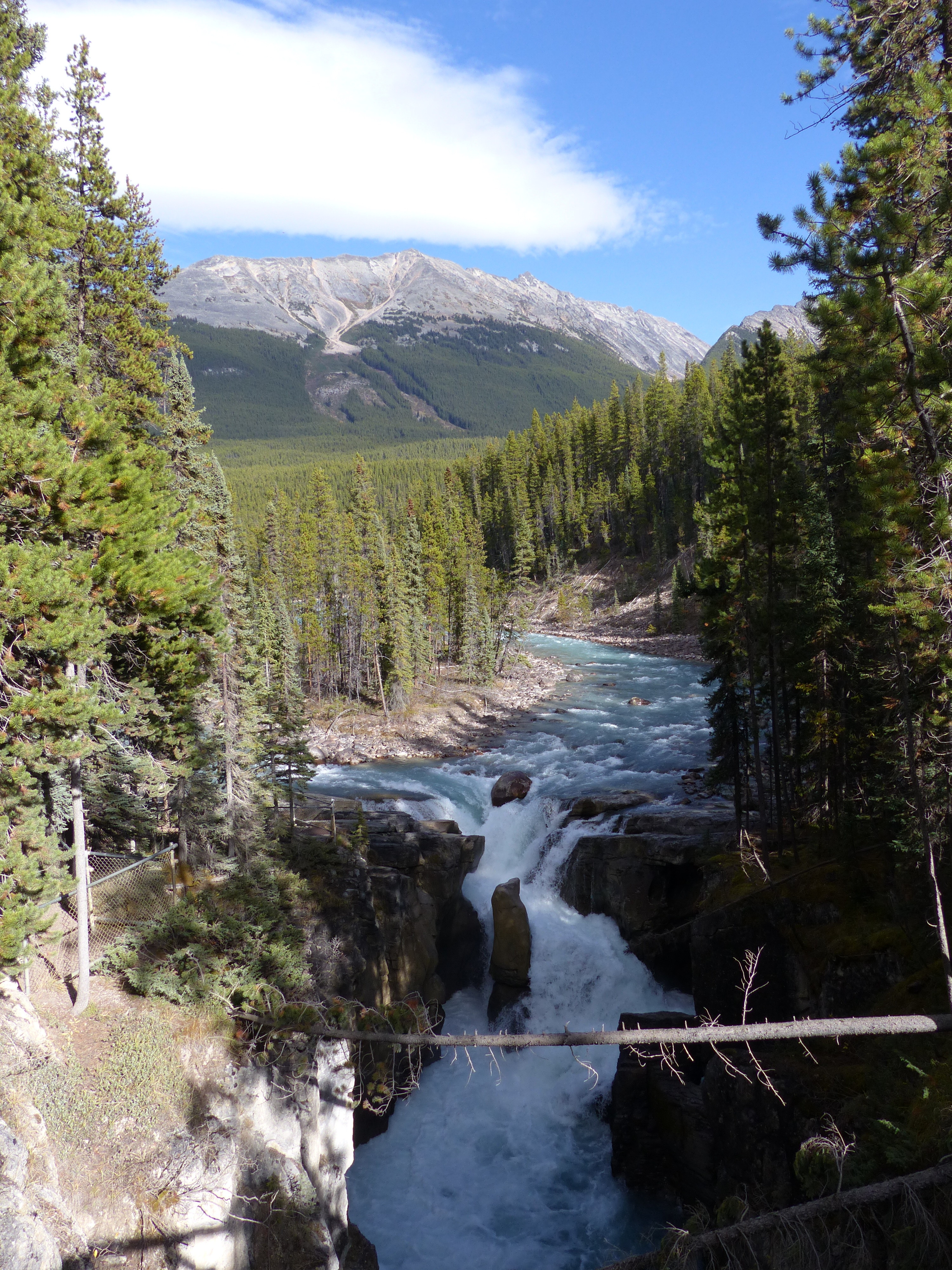 We then headed further south, and where the 93a rejoins the Icefields Parkway, we stopped at the Athabasca Falls. Now, having been to the Niagara Falls, it is going to be difficult for any subsequent waterfalls to match that! However, the Athabasca Falls were still impressive. Later on, we also briefly stopped off at the Sunwapta Falls, where we watched an adrenalin-junkie bird, not much different to a UK blackbird, dive into the water near the top of the falls, and then somehow reappear without being swept over the edge!